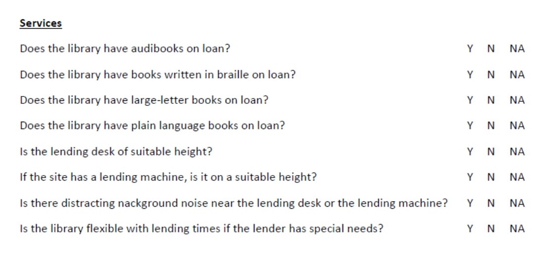 The mappings were carried out by using an accessibility mapping template. The template has been divided according to the function of the mapped spaces. The template’s questions aim to determine the physical accessibility of the mapped facilities, as well as the accessibility of the services offered in each place. In addition, the accessibility of the information available for each mapped location will be charted, including guide signs and websites.