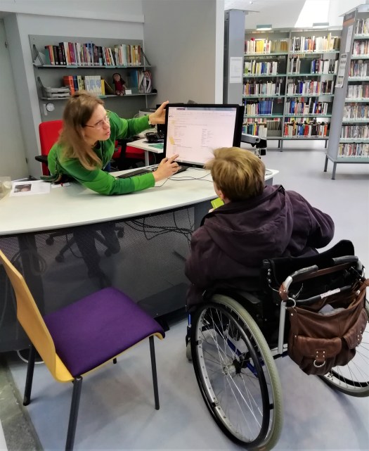 At the Main Library, the team charted the disabled parking and the main entrance, the lobby area and the disabled toilets, the lift and the staircase, reading room, 2nd floor lending library and customer services, 3rd floor music section and toilets, and the toilet facilities of the children’s lending library. Moreover, Tuija-Kaisa Teikari from the library assisted the group in investigating the accessibility of the lending service for electronic materials, such as e-books, and the usability of the customer computers.