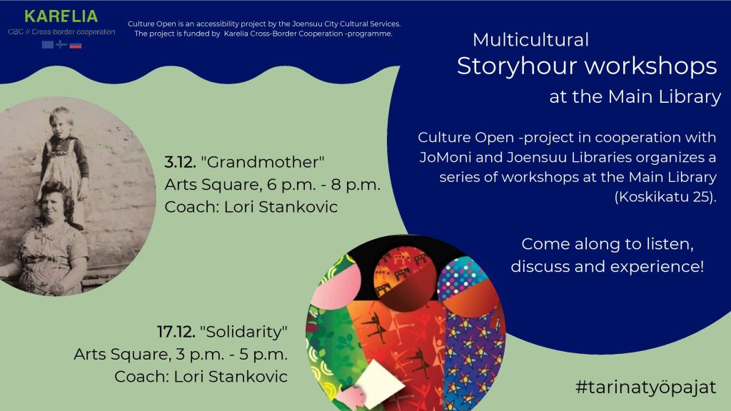 These workshops are a part of Culture Open –project’s co-creative activities. The coaches are all people with immigrant backgrounds, who will share stories of their experiences. Each workshop will have its’ own theme. The workshops are free of charge. The first two workshops will be organized in December, and their themes will be ”Grandmother” and ”Solidarity”. The location for the workshops will be the Main Library’s ”Arts Square” (Taiteiden aukio) on the second floor (Koskikatu 25, 80100 Joensuu).