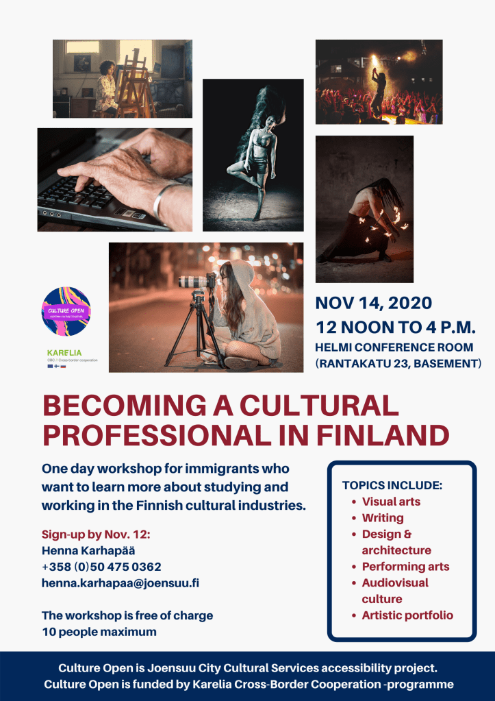 Culture Open –project organizes Becoming A Cultural Professional in Finland –workshop on Saturday, Nov. 14. This workshop is intended for immigrants who wish to pursue studies or a career in the Finnish cultural industries.